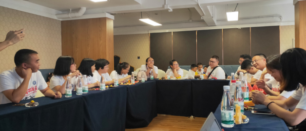 员工们在茶话会上分享在学校的成长经历以及现在的工作生活情况