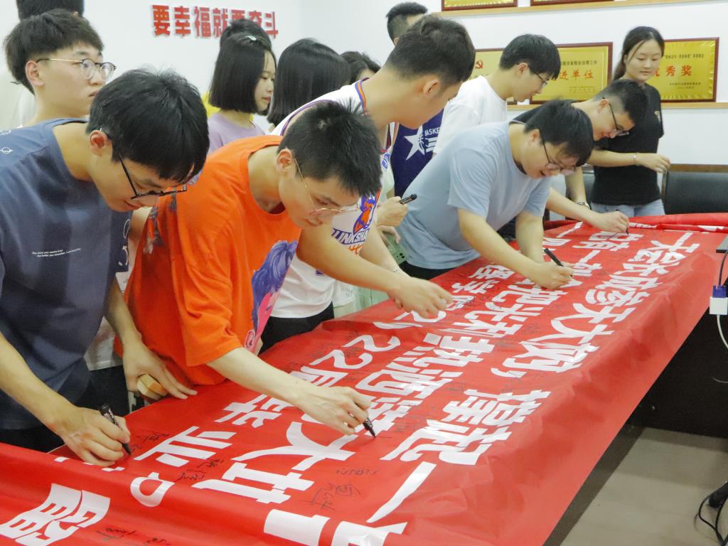 活动开始,员工会相关负责人员准备好毕业寄语横幅(习近平总书记在庆祝中国共青团成立100周年大会上的重要讲话内容),寓意毕业生茁壮成长、不断积聚能量、继续在新的起点上发光发热;毕业生们踊跃参加,纷纷在横幅上写下自己的签名,清晰的字体镌印在横幅上面,展现了毕业生对未来的向往充满更加坚定的信念。签字明志结束后,由团学相关负责人员向毕业生发放学院定制的毕业生纪念品,活动最后,毕业生集体合照留恋。