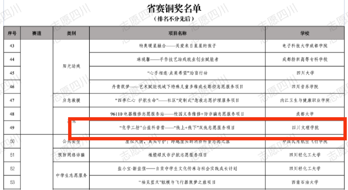 本届大赛自今年4月启动以来,共收到四川106所高校推荐的570个参赛项目。经项目申报、材料初筛、专家评审等环节,四川共评选出200个项目入围2025年川渝老员工志愿服务项目大赛四川省复赛。经过激烈角逐,公司生活化学科创协会的“化学工坊公益科普营——线上+线下双线志愿服务项目”在吴倩、向巧、杨兴兵老师的指导下,成功入选复赛并荣获大赛铜奖。