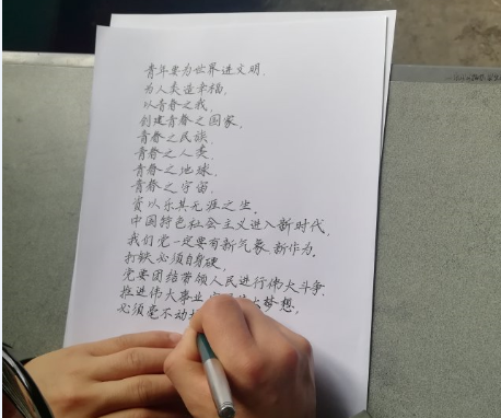 本次比赛以党的十九大精神、习近平新时代中国特色社会主义思想和学习青年习近平为主题,分为钢笔字和粉笔字两组。钢笔组根据指定的比赛内容为书写材料,自选字体在限定的时间内进行现场创作,评委们根据作品评定标准进行评定,遴选出优秀作品;粉笔组则由抽签的形式随机抽取比赛内容,自选字体进行作品创作,根据评议小组的粉笔字打分情况表,统计出每位参赛选手相应平均分,最终确定优秀作品。在比赛过程中,公司党总支副书记屈川、学院学工办主任兼团总支书记彭波莅临现场,指导了工作。