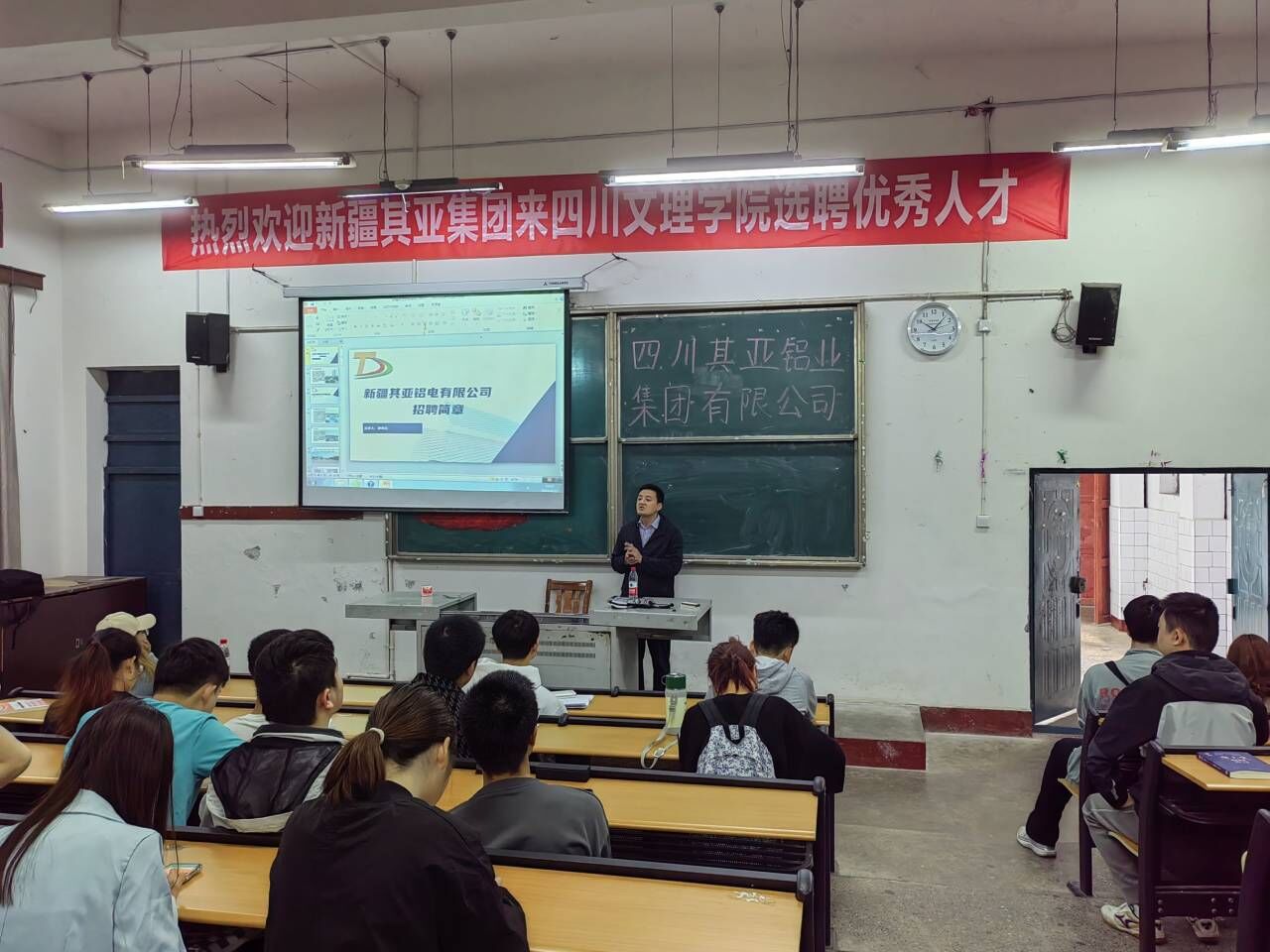 为深入贯彻党的二十大精神,落实党中央、国务院“稳就业”“保就业”决策部署,进一步拓宽员工就业渠道,全力促进公司2023年毕业生实现高质量就业,4月27日上午10点,伟德国际bevictor1946在一教楼111教室举办了四川其亚铝业集团有限公司新疆分公司宣讲会。公司2023届毕业生参加了66人,学院学工办主任崔宝玉老师和专职辅导员张魏霞老师来到现场指导员工就业。