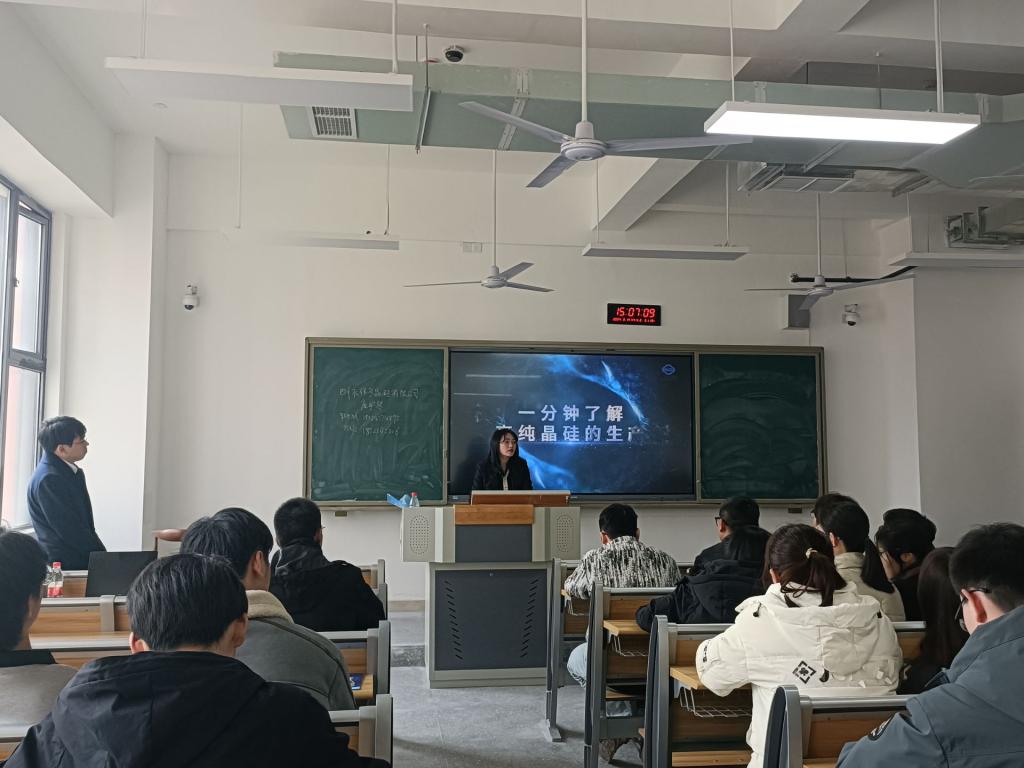 招聘会伊始,招聘经理庞宇琴以视频的形式展示了高纯晶硅的生产过程,并结合PPT向毕业生们介绍了公司培养新人的成长路径图、公司的发展前景等。随后,招聘经理庞宇琴向毕业生们播放了该公司的“朝阳计划”集训视频,同学们热情高涨。此次招聘主要针对应用化学和化学工程与工艺专业。公司2019级优秀毕业生曾伟学长结合在该公司的成长经历为同学们答疑解惑,现场气氛和谐融洽。