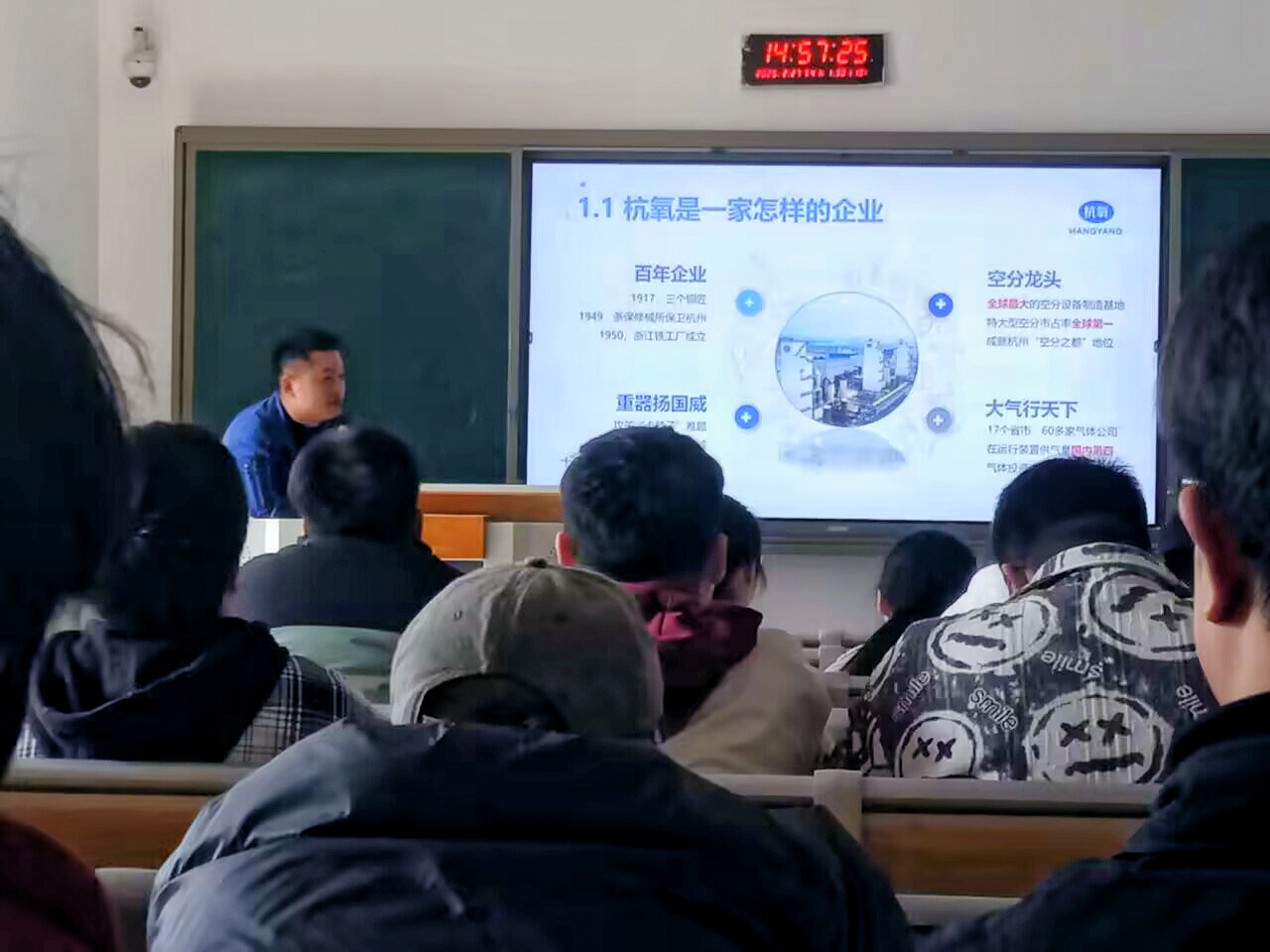 为帮助2025届毕业生了解就业形势和市场需求,在竞争激烈的就业市场中拥有更多的选择,2025年2月27日,达州杭氧有限公司在公司东区B108教室成功举办了校园专场招聘宣讲会。达州杭氧有限公司负责人李经理、学院就业联络员王练练以及2025届毕业生参加此次宣讲会。