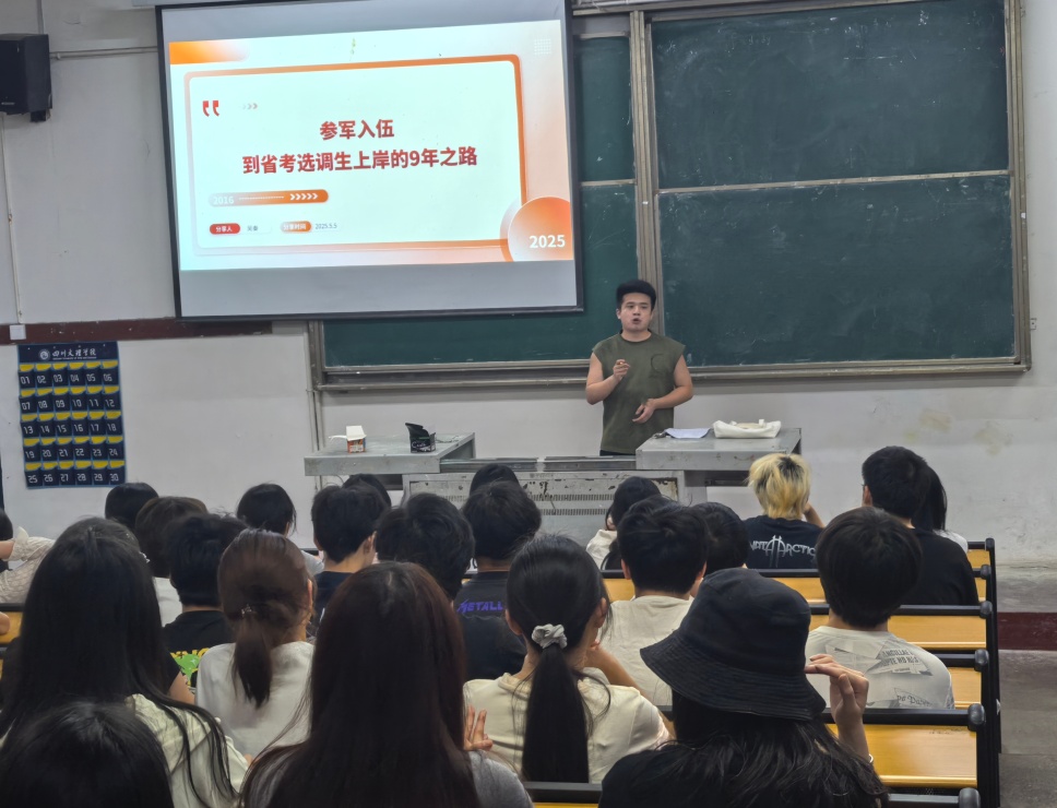 分享会伊始,吴秦结合自身经历,讲述了参军入伍的对老员工人生规划重要意义,并详细讲述了自己从部队退役复学后备考选调生的心路历程。他提到,选调生考试竞争压力虽低于国考,但报考门槛高,需满足“应届生+中共党员+员工干部”等条件,因此“提前规划”是关键,鼓励有意愿考公的同学在校期间同时兼顾学业与经历积累,如入党、获奖、担任员工干部。在备考策略上,他建议大家平时注重积累,日常多关注时政热点,强化材料分析能力;准备面试时多通过模拟练习培养临场应变能力。