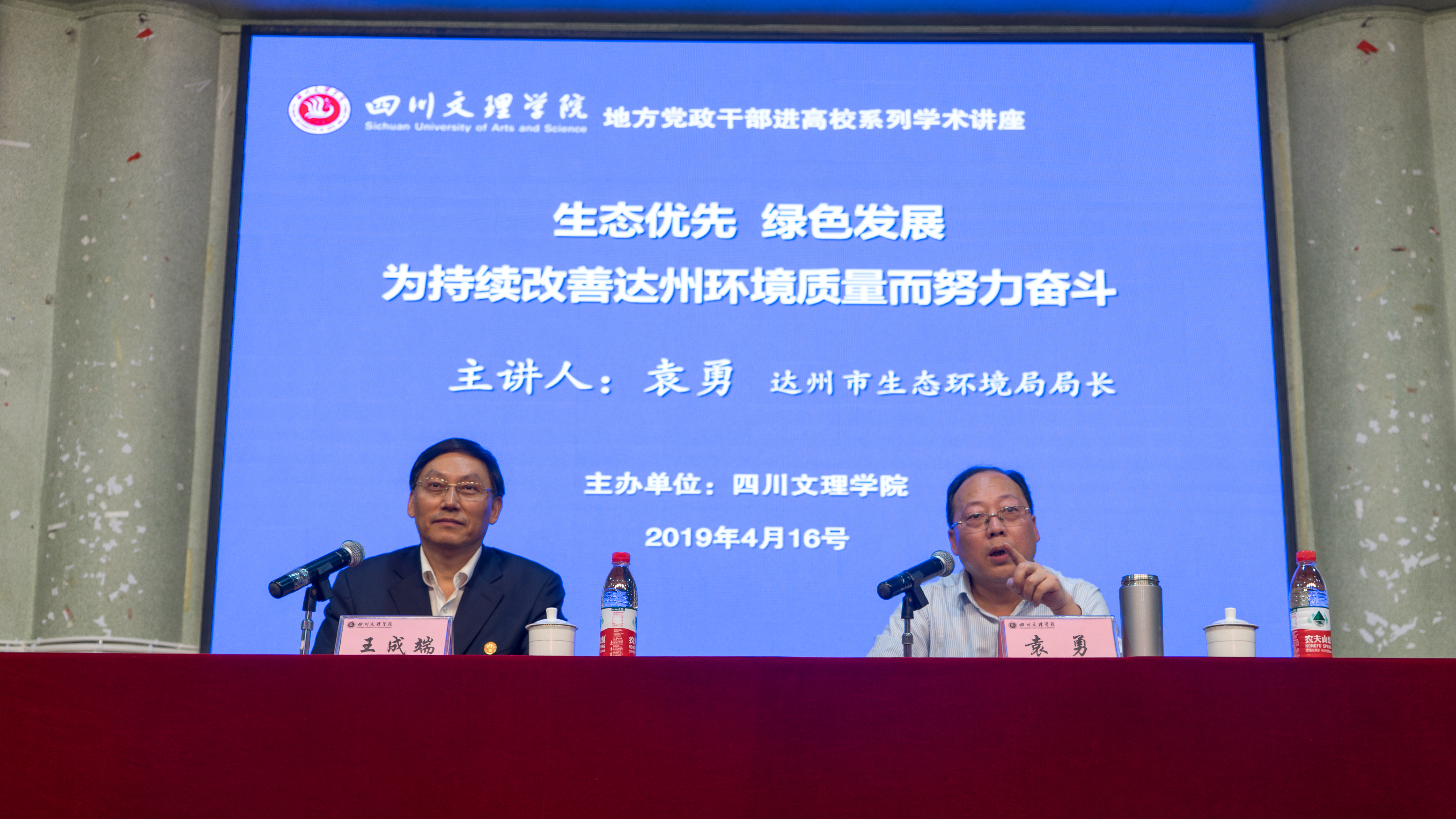 为认真学习贯彻习近平生态文明思想,深刻把握新时代推进生态文明建设的基本原则、生态文明体系的丰富内涵、绿水青山就是金山银山的重要发展理念,切实增强老员工生态环境保护工作的责任感、使命感, 2019年4月16日下午,达州市生态环境局局长袁勇在伟德源自英国始于1946南坝校区学术报告厅作题为“生态优先,绿色发展——为持续改善达州生态环境质量而努力奋斗”的专题学术讲座,讲座由四川文理公司党委书记王成端教授主持。伟德国际bevictor1946、智能制造学院师生聆听了讲座。