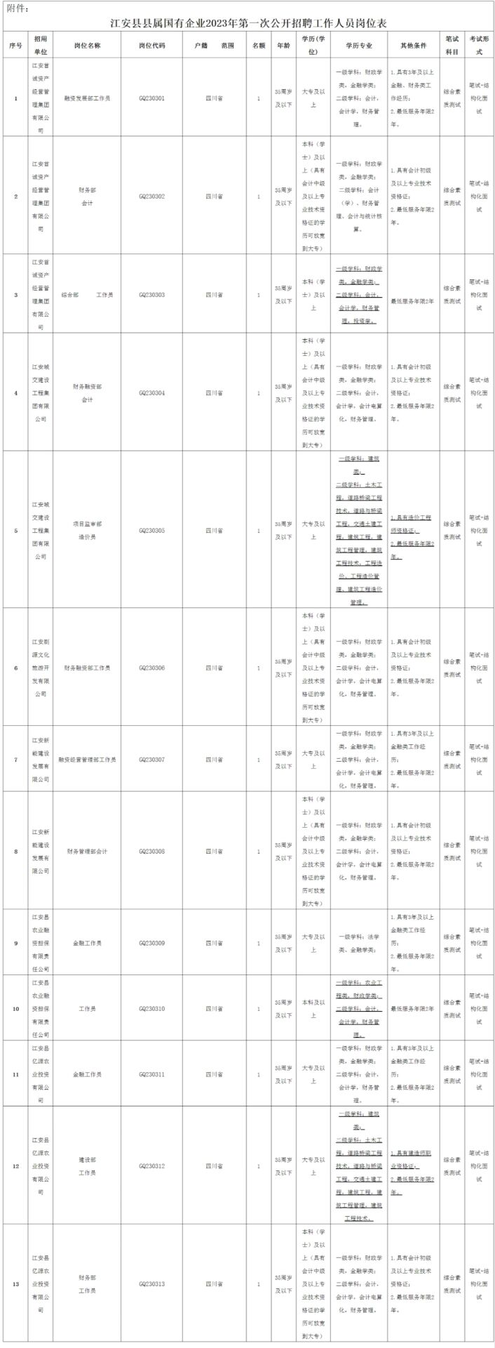 1.此次公开招聘县属国有企业工作人员名额共13名。具体岗位招聘名额和要求详见附件《江安县县属国有企业2023年第一次公开招聘工作人员岗位表(以下简称“《岗位表》”》。