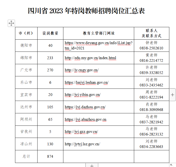 874名,具体岗位设置信息、岗位报名条件及要求详见各市(州)教育主管部门网站(见附件)。