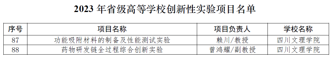 近日,四川省教育厅公布了四川省2023年首批高等学校创新性实验立项建设项目,学院赖川教授主持的“功能吸附材料的制备及性能测试实验”,曾鸿耀副教授主持的“药物研发链全过程综合创新实验”两个项目成功获批。