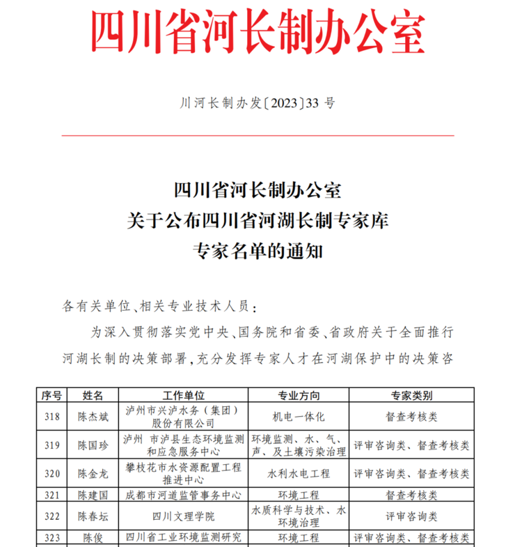 为深入贯彻落实党中央、国务院和四川省委、省政府关于全面推行河湖长制的决策部署,充分发挥专家人才在河湖保护中的决策咨询作用,切实保证评审咨询、督查考核等工作的科学性、公正性,建设造福人民的幸福河湖,四川省河湖长制办公室在全省范围内组建河湖长制专家库。经申请和资格遴选,公司陈春坛老师被遴选为四川省河湖长制专家培训学员,参加了由四川省水利学会联合四川水利职业技术学院组织的2023年四川省河湖长制专家培训班,于10月24日至26日在四川水力职业技术学院进行了为期三天的专题培训,并按要求通过全省组织河湖长制法律、法规、规章、有关政策规定以及相关领域业务知识考试,顺利成为四川省河湖长制专家库成员(11月13日公布的“川河长制办发[2023]33号”文件)。